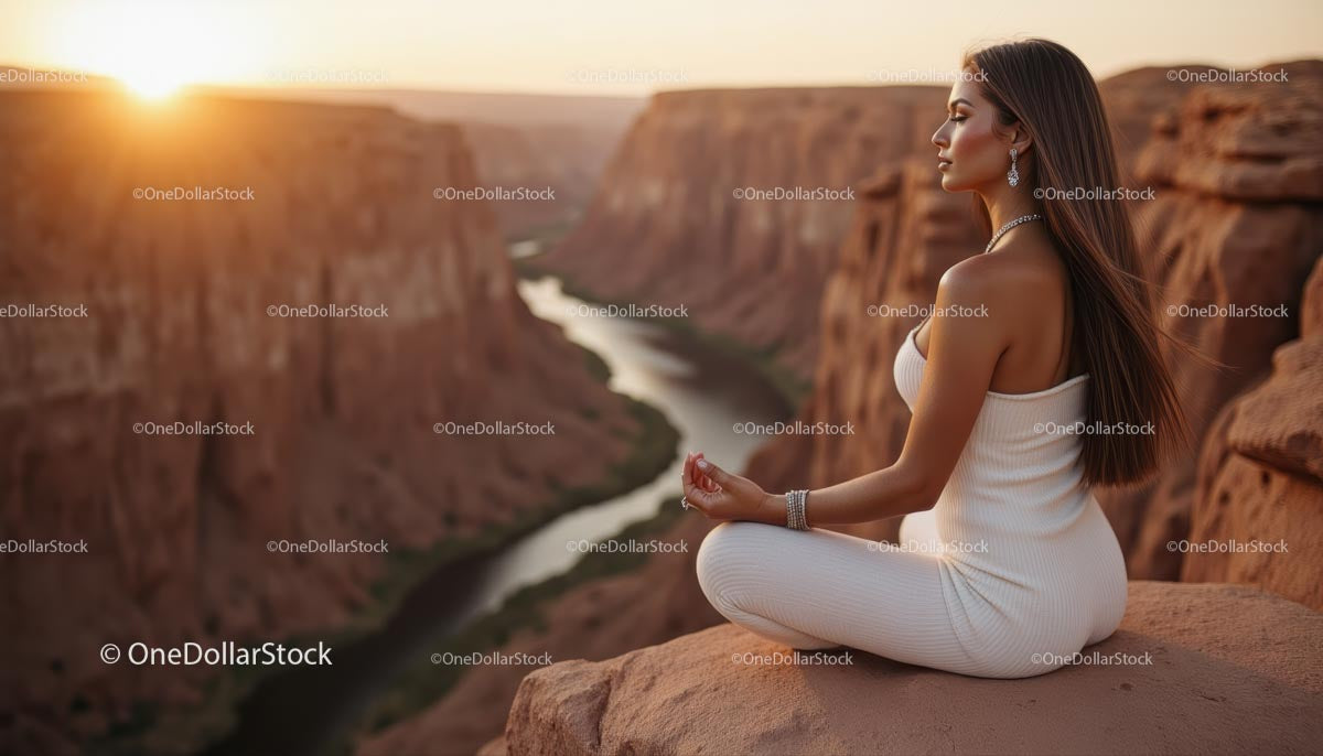 Woman Meditating at Sunset Over Majestic Canyon