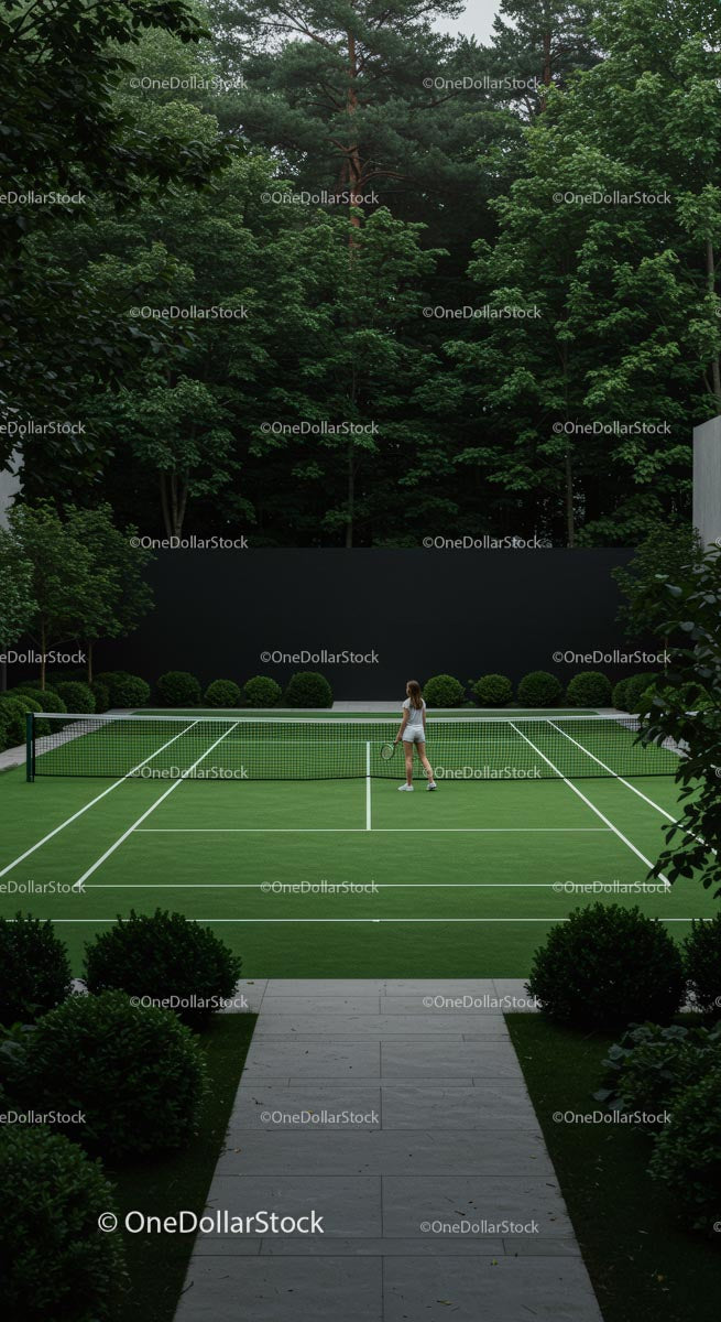Woman Playing Tennis on a Green Court Surrounded by Trees