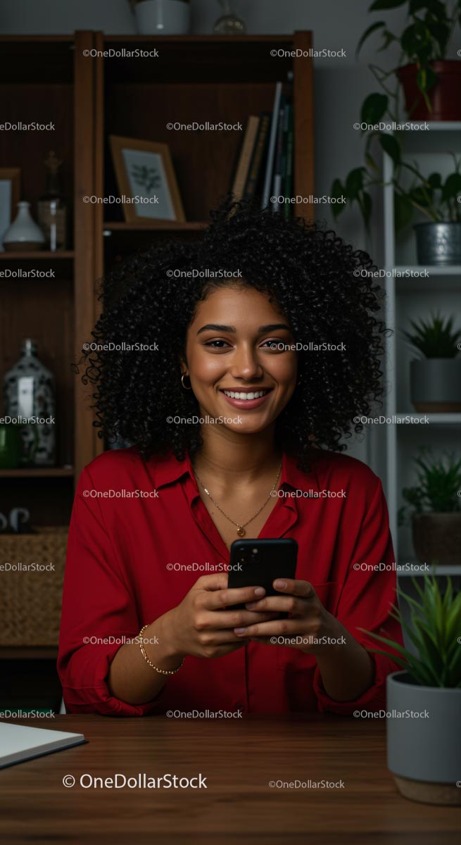 Woman with Curly Hair Smiling While Holding Smartphone (12 Images)