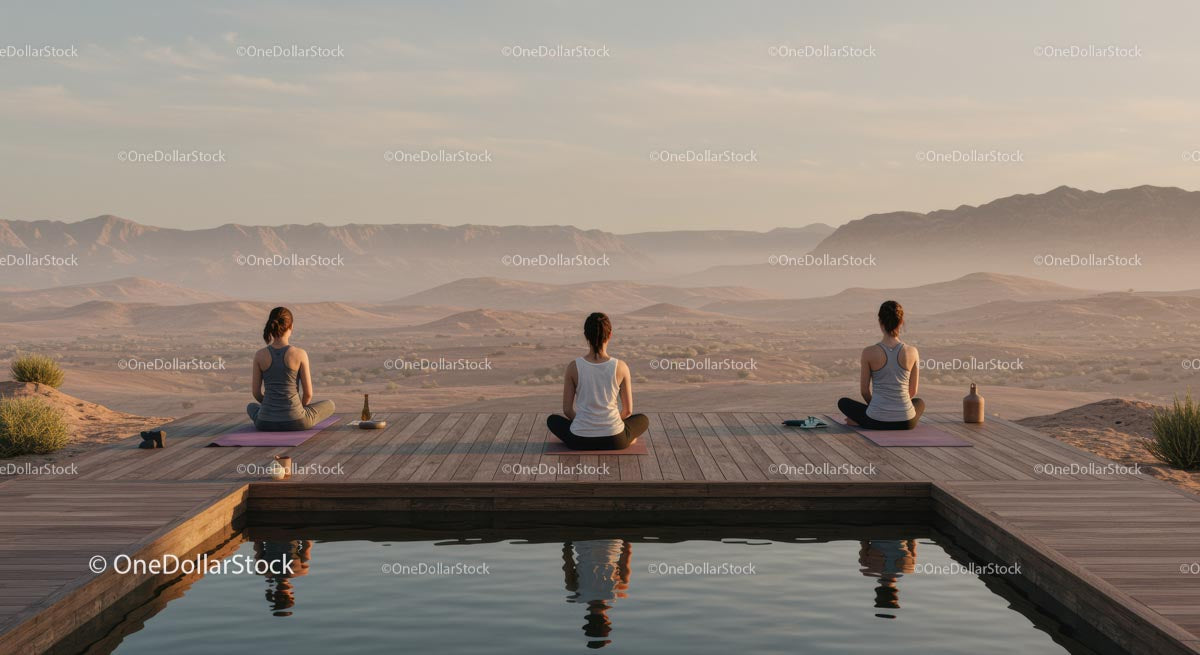 Women in Yoga Meditation at Sunset in Desert Landscape