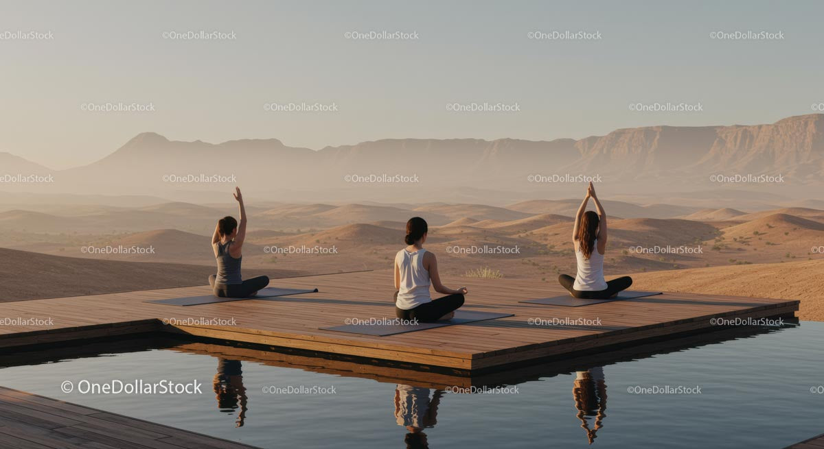 Women Practicing Yoga on Deck with Desert Sunrise