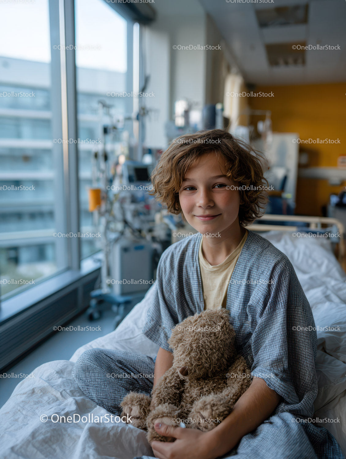Young Boy Sitting in Hospital Bed Smiling with Teddy Bear