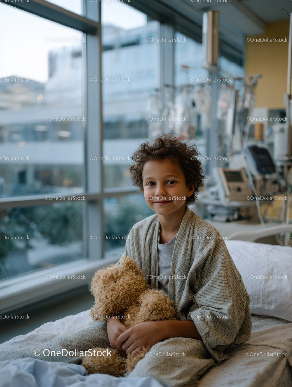 Young Child Smiling with Teddy Bear in Pediatric Hospital Room