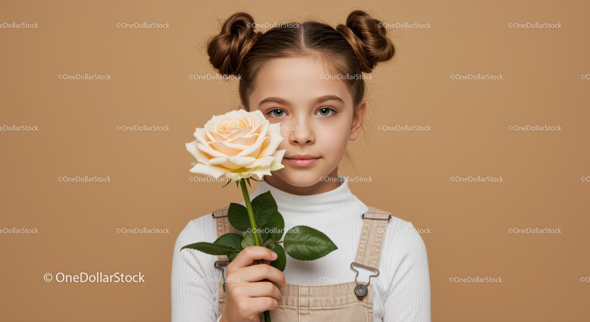 Young Girl Holding Elegant Cream Rose Portrait with Beige Background