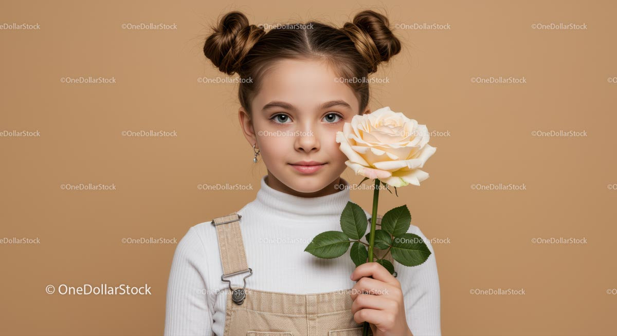 Young Girl Holding White Rose on Beige Background for Portrait Photography