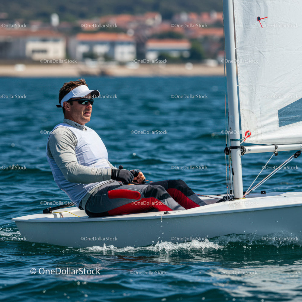 Young Male Sailor Navigating a Small Sailboat in Open Water