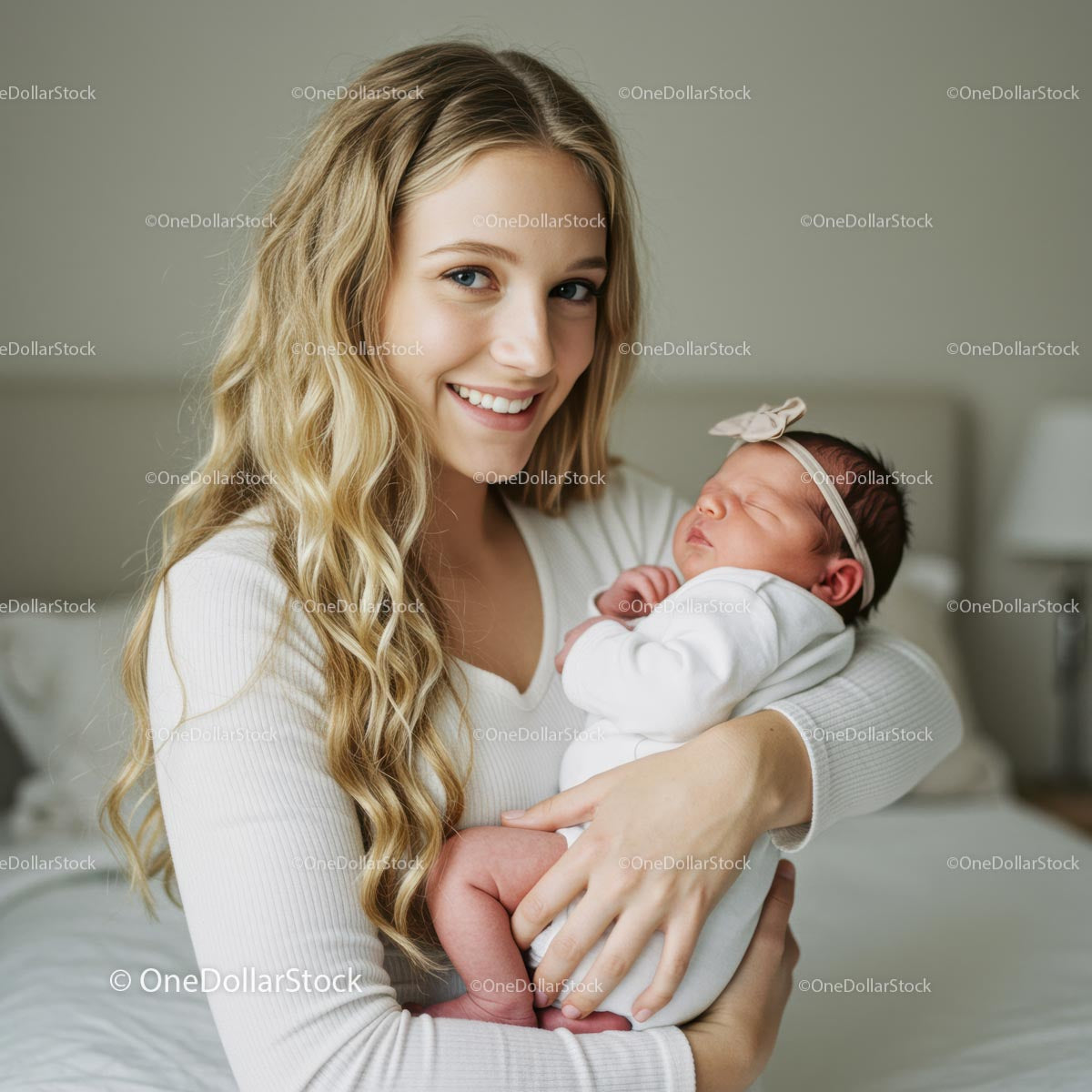 Young Mother Holding Sleeping Newborn in Cozy Home Setting