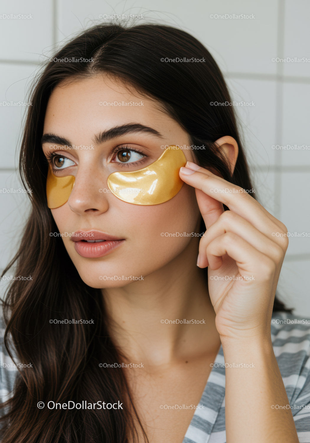 Young Woman Applying Gold Eye Masks for Skincare Relaxation