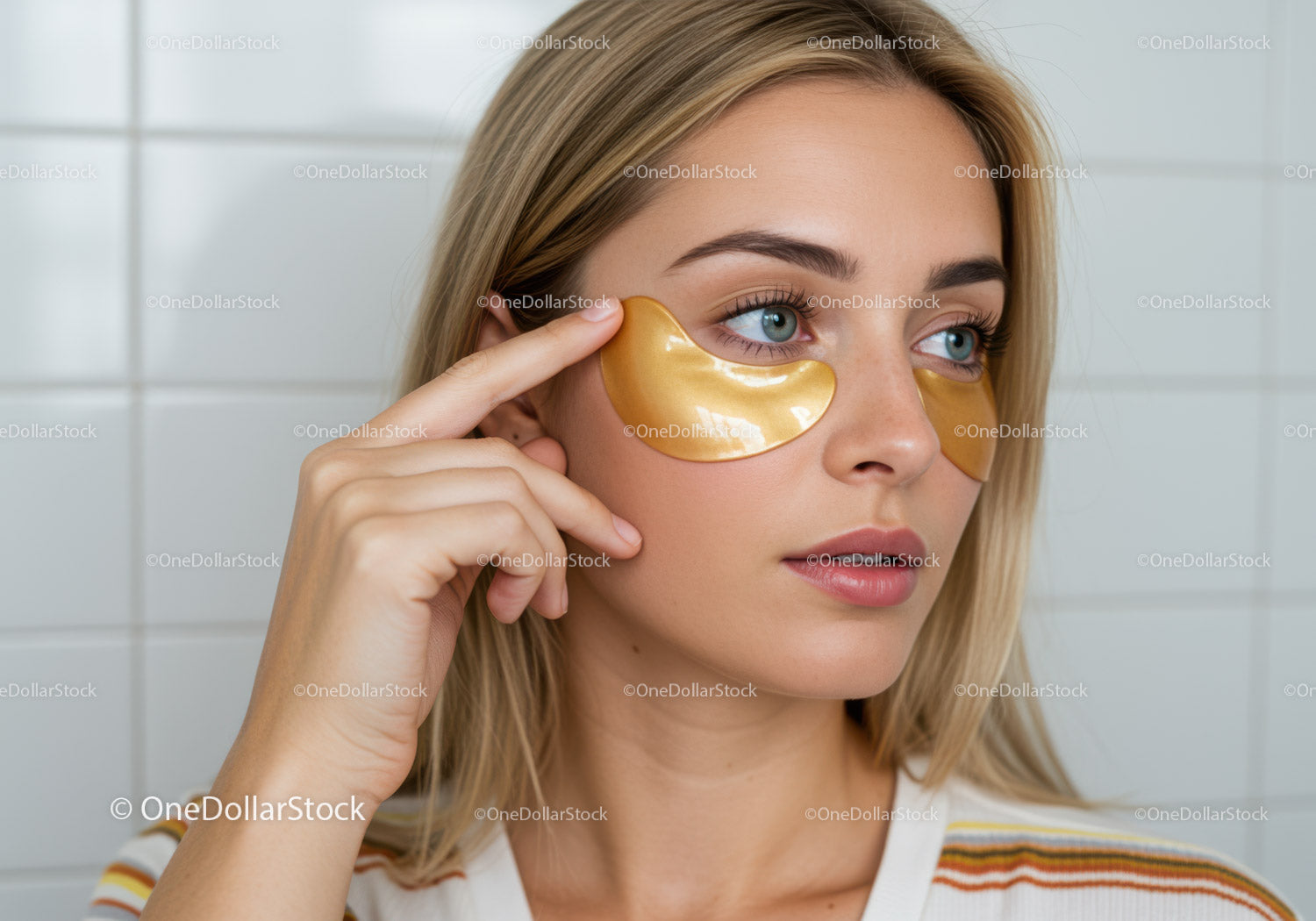 Young Woman Applying Under-Eye Gold Collagen Patches for Skincare