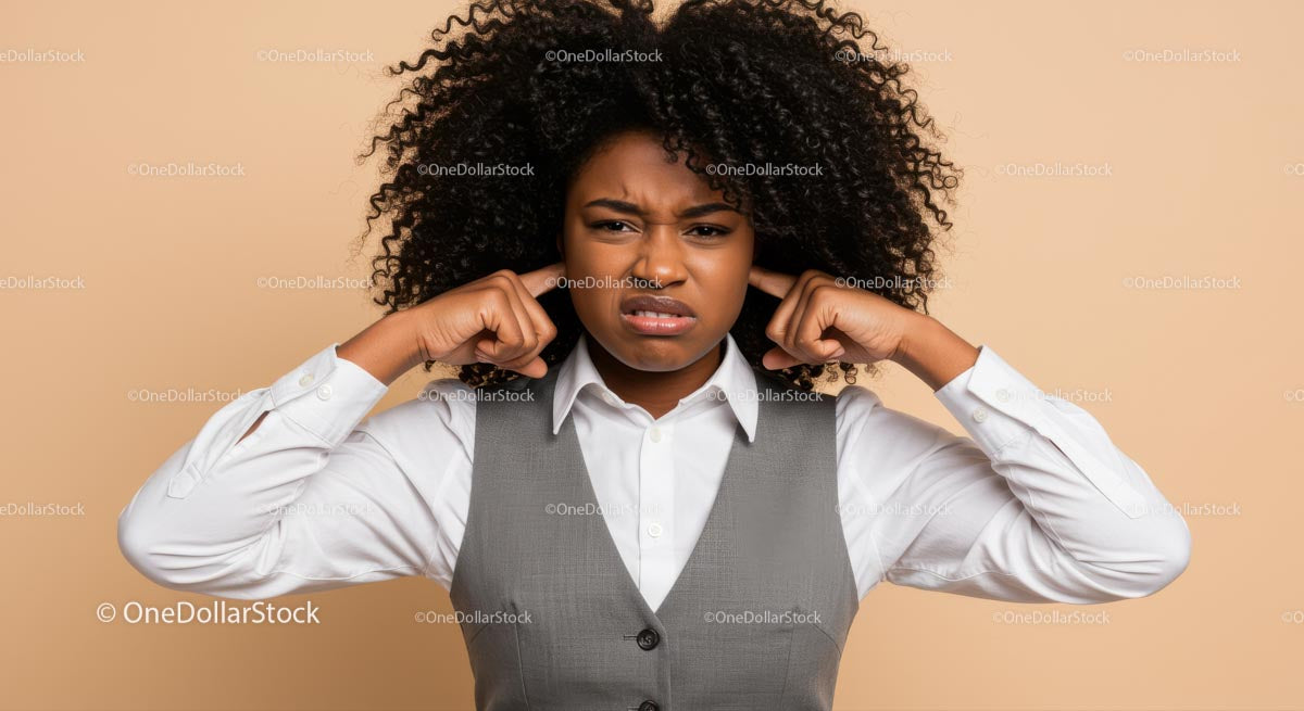 Young Woman Covering Her Ears with Earplugs Showing Displeasure