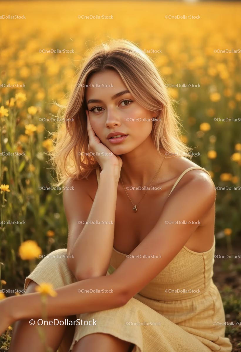 Young Woman in Summer Dress Among Yellow Flowers at Golden Hour