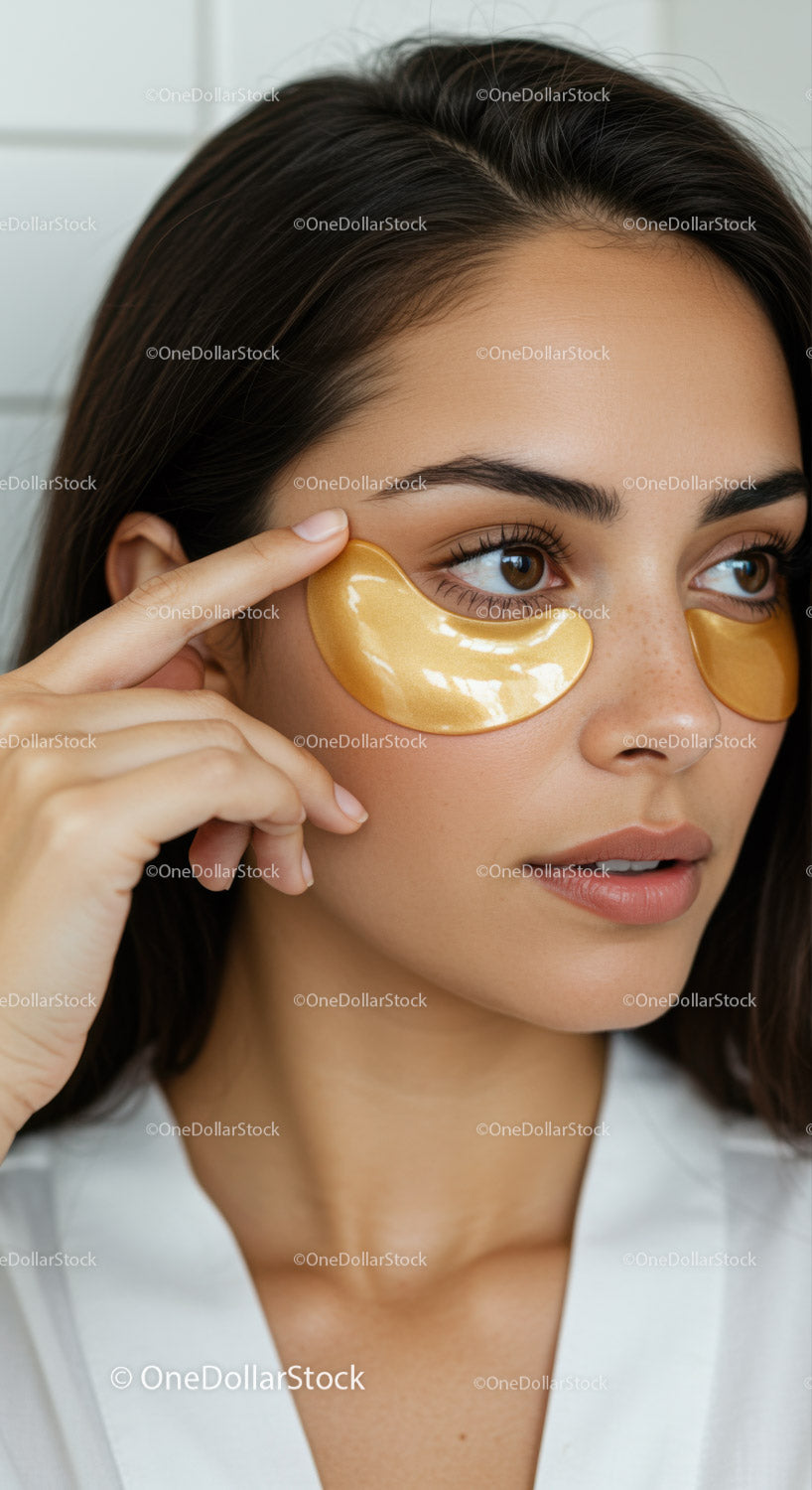 Young Woman in White Shirt with Under-Eye Patches Ready for Skincare Treatment